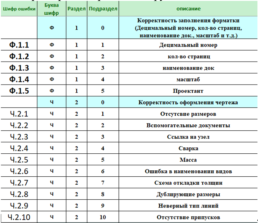 Шифры классифицируют ошибки по типам (например, ошибка в размерах, неверные обозначения или нарушение стандартов). Это позволяет исполнителю без дополнительных пояснений разобраться в проблеме, а начальникам отделов стандартизировать процесс обнаружения ошибок и их фиксации.