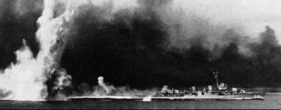 В октябре 1943 года он вышел в свой первый боевой поход. Оперативное соединение направлялось для удара по Рабаулу, и во время похода «Кидд», отставший от основной группы, попал под налет японской авиации. Благодаря отличной выучке моряков и мощному зенитному вооружению экипажу удалось сбить три из восьми японских самолётов и при этом подобрать экипаж сбитого американского самолета. В конце ноября 1943 года во время атаки Таравы зенитчики записали на свой счет еще два японских бомбардировщика.