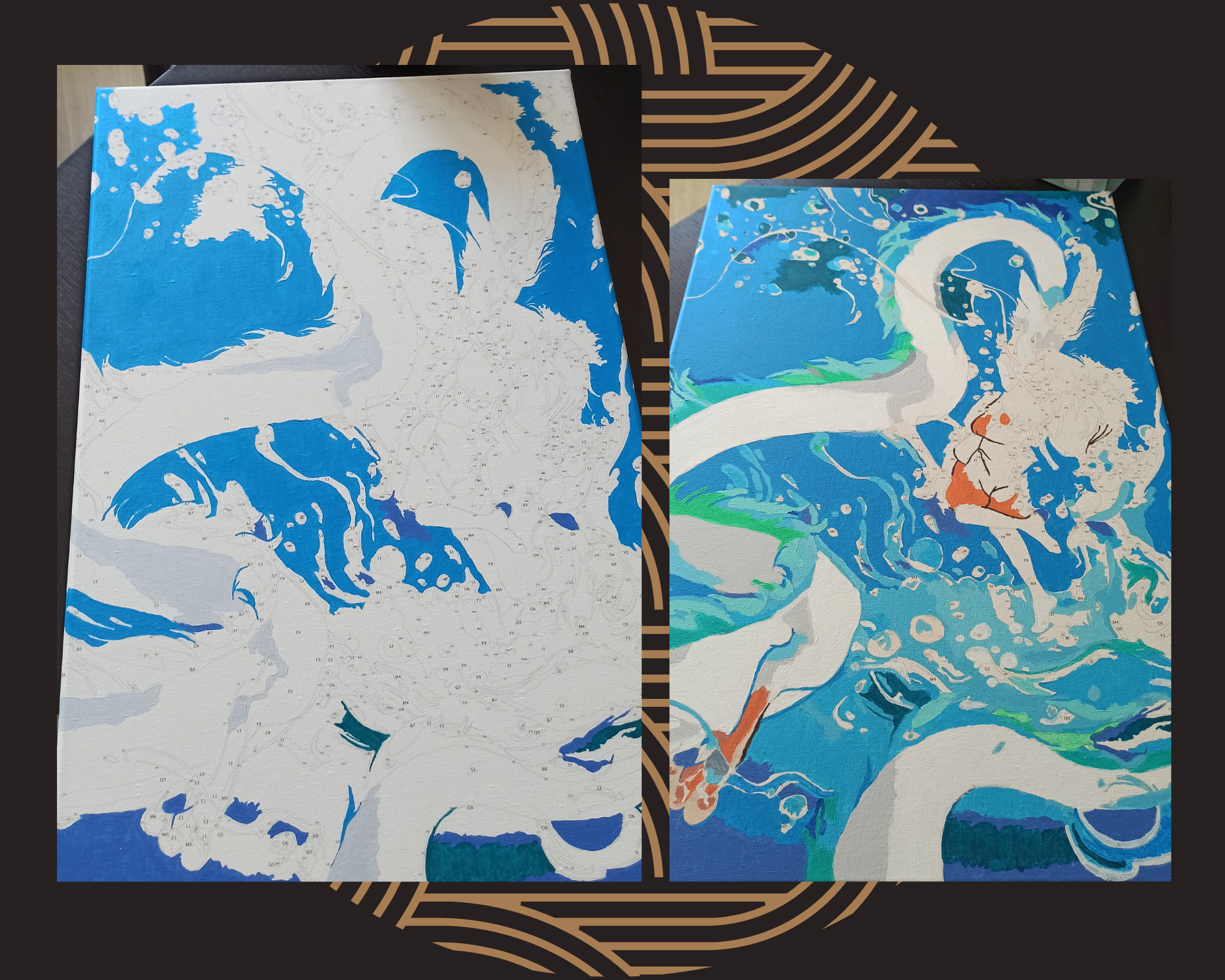 С каждым годом японская мультипликация всё больше захватывает мир и людские сердца. Моё сердце не стало исключением. Шедевры Хаяо Миядзаки и Studio Ghibli знакомы многим. С самого детства любимый мой мультфильм этого потрясающего аниматора - "Унесённые призраками". Мультфильм оставляет неизгладимое впечатление на детей и взрослых. Когда на ягодном маркетплейсе я увидела эту картину, то сразу заказала. На самом деле, это третья моя картина по хронологии. И наименее любимая. Не знаю почему. Сам заказ был в полной комплектации: хороший холст, свежие краски, лист с подсказками из цифр и набор кисточек. Краски свежие, рама прямая - всё хорошо и отлично. После распаковки сразу приступила к проявлению главных героев на холсте.