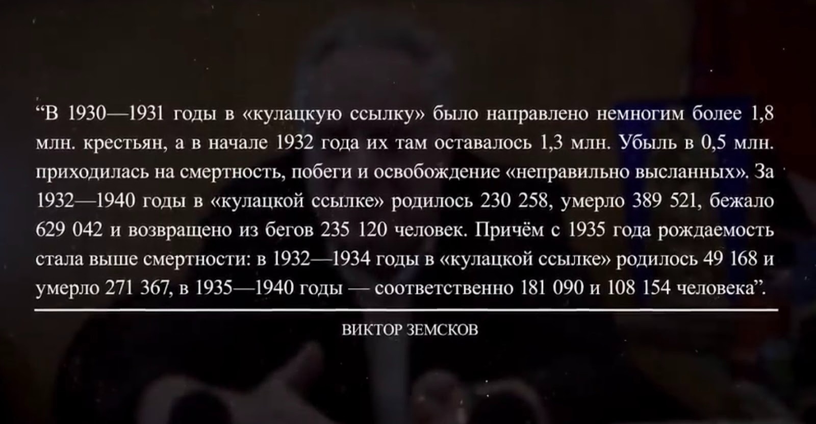 «В 1930-1931 годы в “кулацкую ссылку” было направлено немногим более 1,8 млн. крестьян, а в начале 1932 года их там оставалось 1,3 млн. Убыль в 0,5 млн. приходилась на смертность, побеги и освобождение “неправильно высланных”. За 1932-1940 годы в “кулацкой ссылке” родилось 230 258, умерло 389 521, бежало 629 042 и возвращено из бегов 235 120 человек. Причем с 1935 года рождаемость стала выше смертности; в 1932-1934 годы в “кулацкой ссылке” родилось 49 168 и умерло 271 367, в 1935-1940 годы – соответственно 181 090 и 108 154 человека».