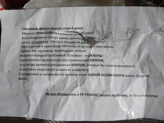 Жительница поселка Володарского Ленинского района МО расклеила на подъездах дома в котором проживает объявления с призывом уничтожать ласточкины гнезда, которые появились на окнах некоторых квартир. По мнению женщины, ласточки являются распространителями клопов.