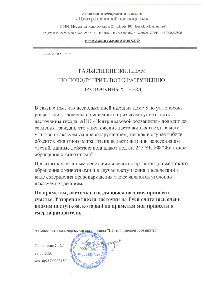 Жильцы предложили ограничиться пока расклейкой информационных листков на подъездах о недопустимости подобных действий. Такое информационное письмо написали сотрудники зоозащитной организации и переслали жителям.