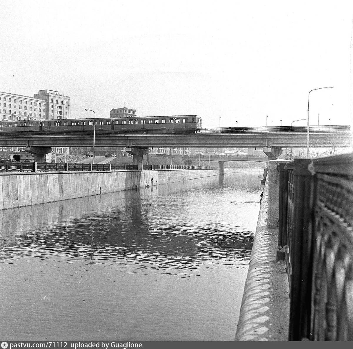Преображенский метромост в 1970 году. Вид от Русаковской набережной. Автор фото: Ю. Артамонов. С сайта www.pastvu.com.