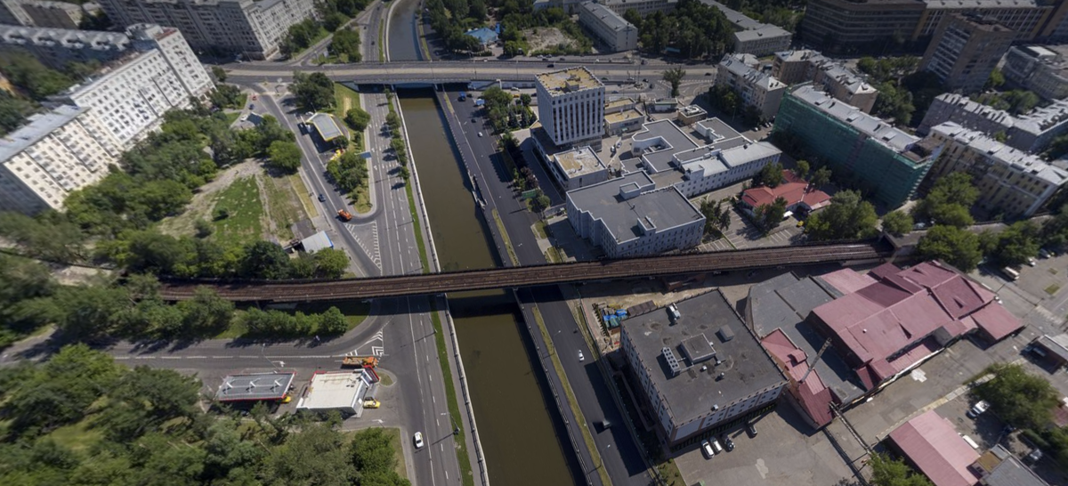 Левый берег Яузы здесь в общем-то был свободен от застройки. А вот на правом стояло много зданий и жилых кварталов. Поэтому часть метромоста пришлось сооружать прямо между домами. Участок от "Сокольников" до Яузы проходили закрытым способом. То есть тоннели прокладывали с помощью специального щита. Ближе к реке рельсы выходили на поверхность, пересекали водную преграду и через какое-то время снова оказывались под землёй.