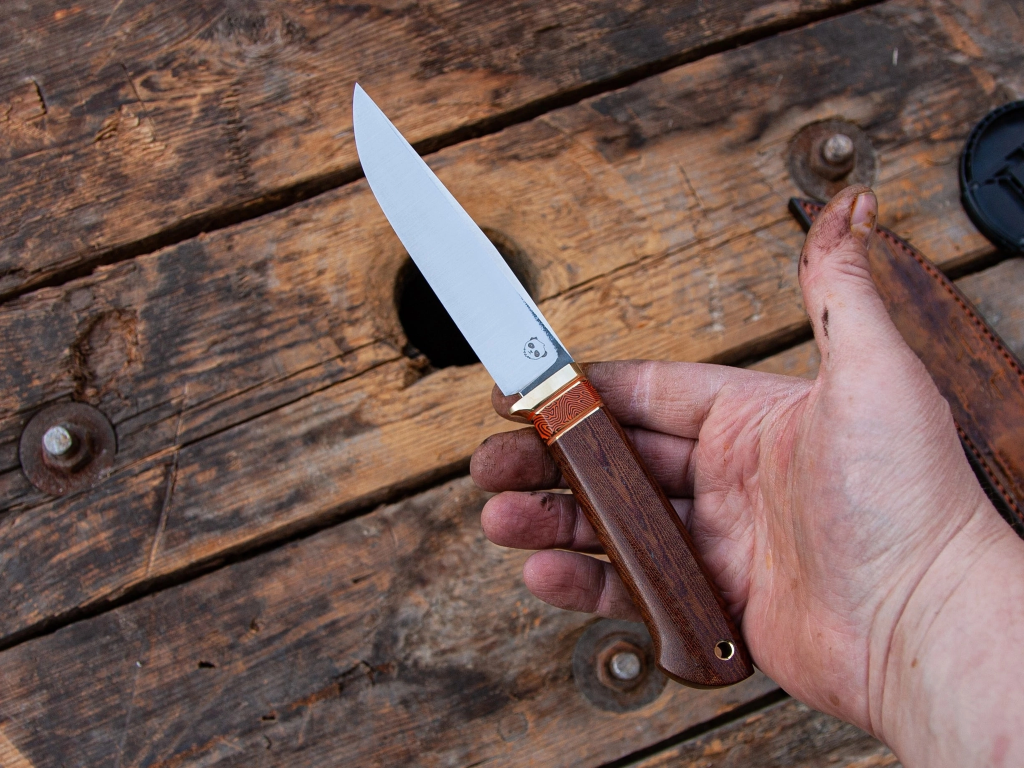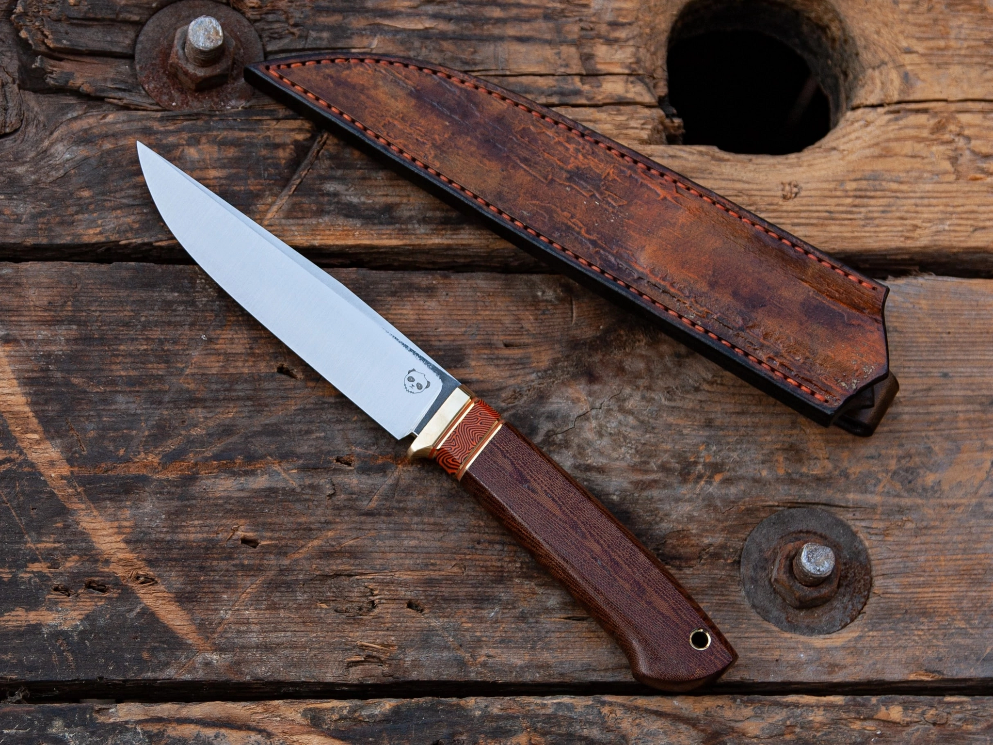 На рукояти текстолитовое дерево, больстер/трубка латунь и проставки из рыжей G10 и микарты от Crazy fiber.