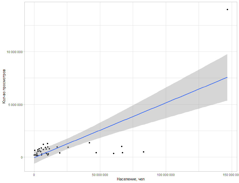 Можешь посмотреть статью https://habr.com/ru/post/492326/#, если кратко - нет там зависимости между населением и просмотрами.