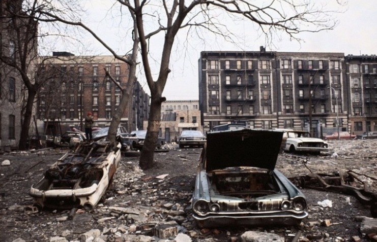 Разбитые холодильники и сгоревший Мустанг 1965 года, на фоне каркаса строящегося здания которое никогда не будет закончено. Бризи-Поинт, Куинс, 1973 год. Судя по этим фото, угнать и сжечь машину в тихом месте, это старая добрая нью-йоркская традиция.