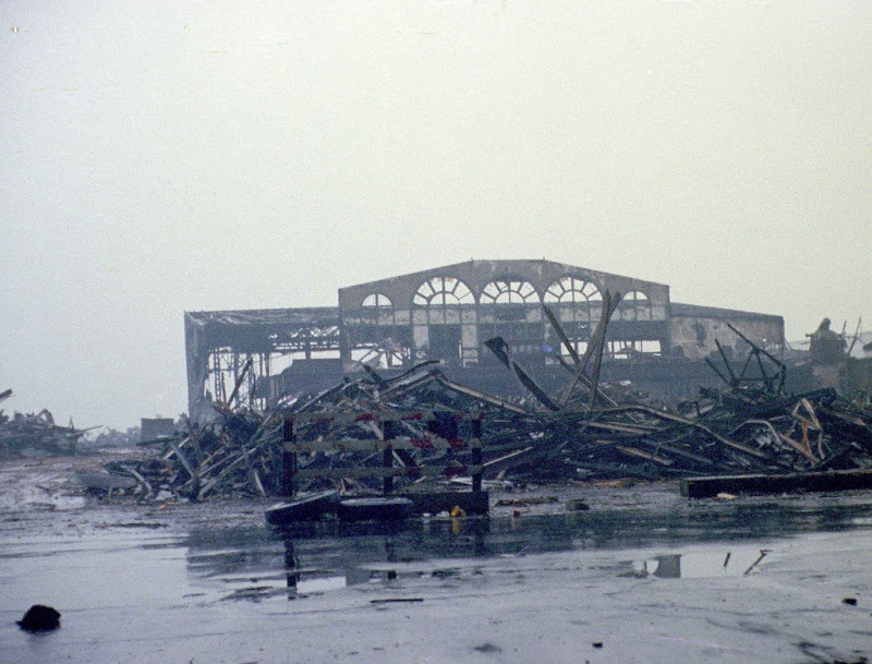 Заброшенный пирс через дорогу от зданий ВТЦ. На этом месте сейчас здания Всемирного Финансового центра и Бэттери-парк. 1973 год.
