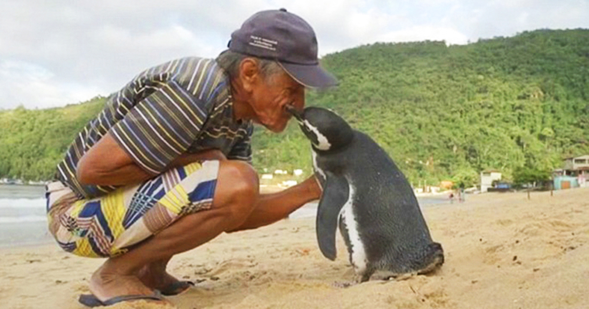 Это известная парочка. Как-то дед выходил пингвина и тот даже после того как уплыл, постоянно возвращался на этот берег к деду.