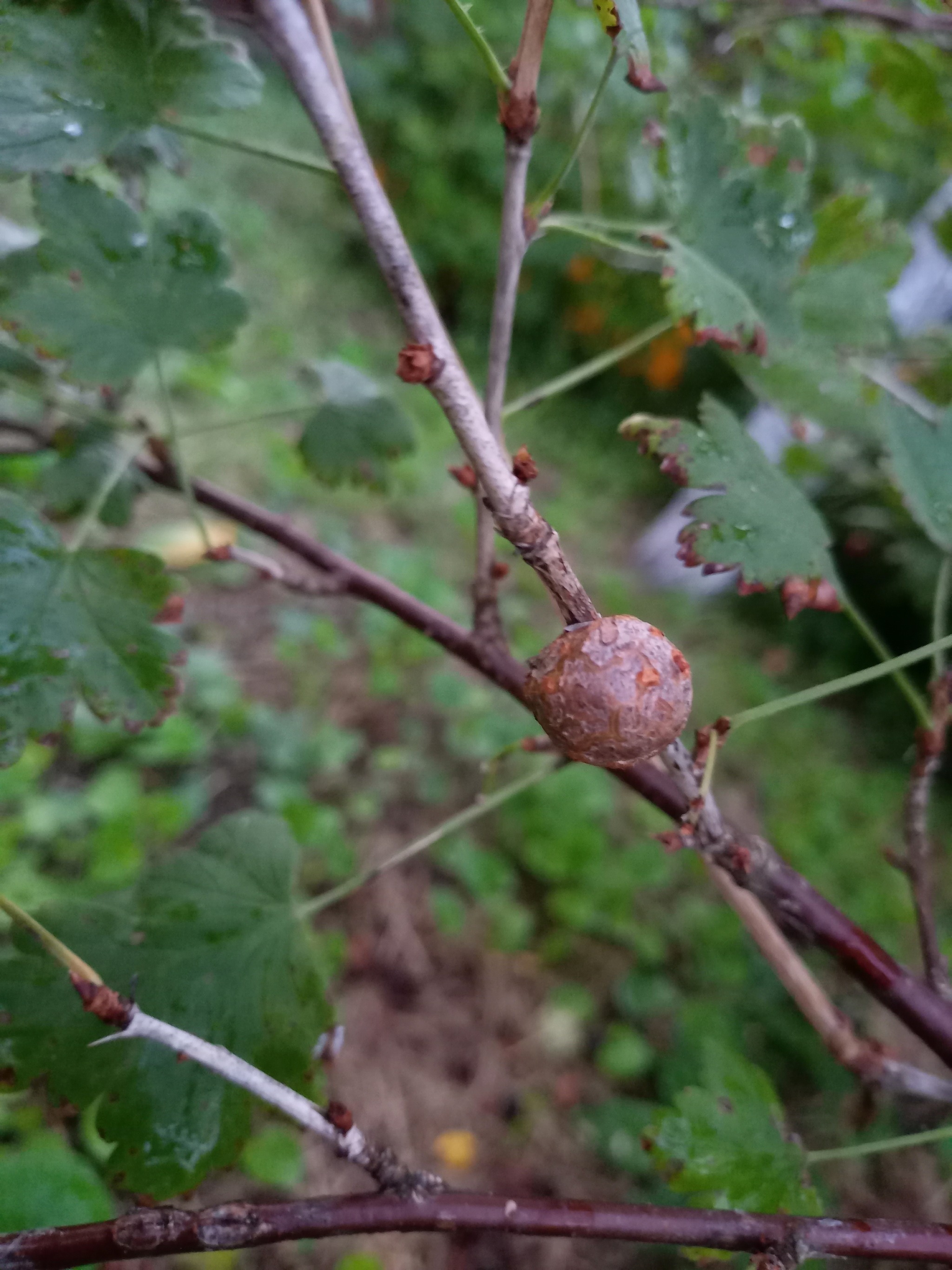 Растёт у меня на даче уже несколько лет замечательный куст – гибрид чёрной смородины и крыжовника. Сегодня в очередной раз я полез собирать свои любимые ягоды и наткнулся на вот такую странную штуку, вросшую прямо в веточку: