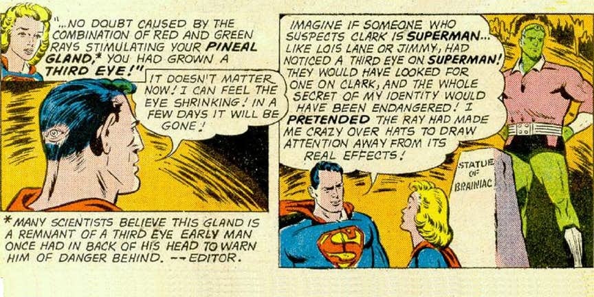 Брэйниак шарахнул Супермэна красным криптонитом в комиксе Action Comics #275. Поначалу казалось, что красный криптонит превратил Человека из Стали в шляпника. Он перестал появляться на людях без какого-нибудь головного убора, и начал пользоваться «приколами», связанными со шляпами. В тюрбане прорицателя Супермэн вооружился хрустальным шаром, в солдатской каске строил из себя солдата. Впрочем, выяснилось, что на самом деле у него просто вырос третий глаз на затылке.