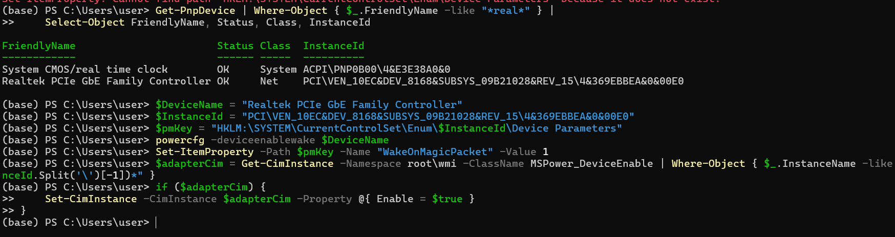 Здесь возникает проблема. Имя этого параметра может отличаться у разных производителей. Например, для Intel это *WakeOnMagicPacket, а для Realtek — WakeOnMagicPacket (без *). Если настройка не применяется, проверьте правильное имя командой Get-ItemProperty -Path $pmKey и используйте его.