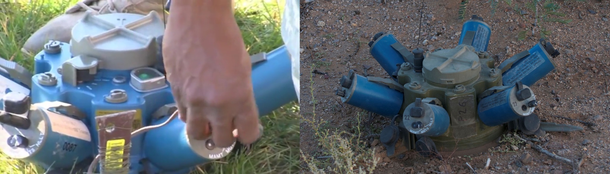 - использовала в качестве поражающих устройств противопехотные осколочные мины направленного поражения M18A1 Claymore и их нелетальный аналог M5 MCCM (Modular Crowd Control Munition; данный инженерный боеприпас использует в качестве поражающих элементов не стальные, а резиновые шарики в количестве 600 шт, а также светошумовой эффект [3]; визуально отличается от M18A1 цветом, насесенной на задней стороне надписью NON-LETHAL MCCM и тиснением в виде ромбов);
