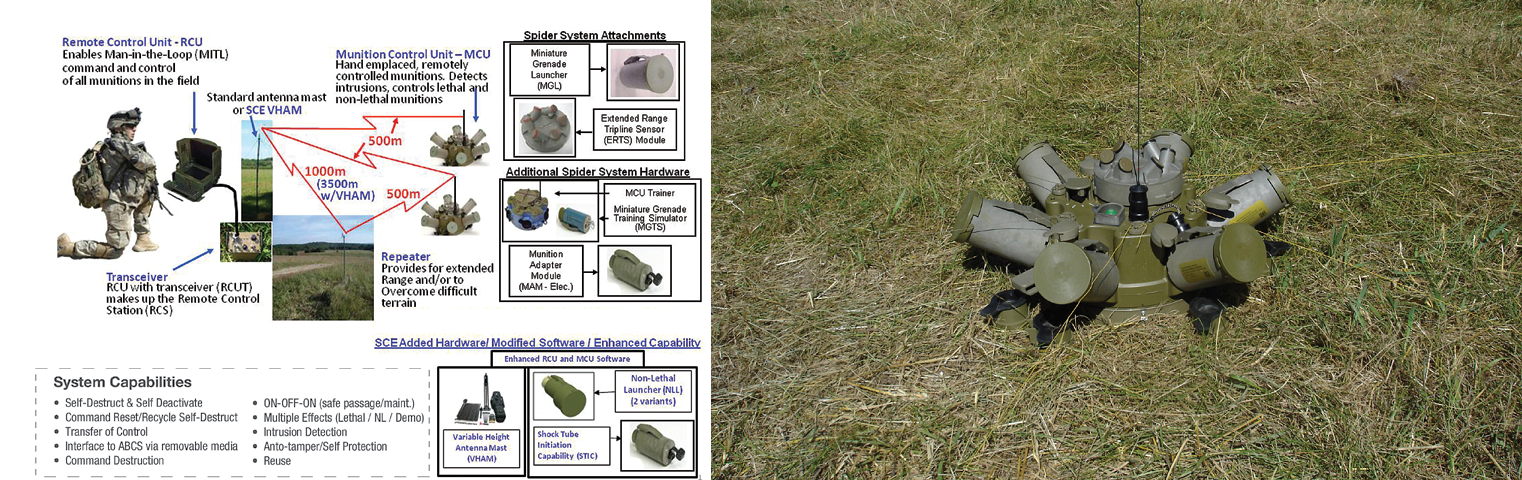 Примечание. Декларируется, что XM-7 может работать только в управляемом варианте с наличием оператора (Man-In-Loop-Mode). Американская армия утверждает, что все поставленные XM-7 Spider не имеют возможности самостоятельного срабатывания, вызванного жертвой (т. н. victim- activated). Но это декларируется. В ответе на запрос о наличии такой возможности, сделанный организацией Human Rights Watch и в докладе, направленном Пентагоном в Конгресс США говорилось[2], что подобный алгоритм действий (Target Operation Mode) есть, и он чисто программного характера, т.е. в «железо» никаких изменений вносить не нужно. В противном случае, это снижало бы возможности ее использования.