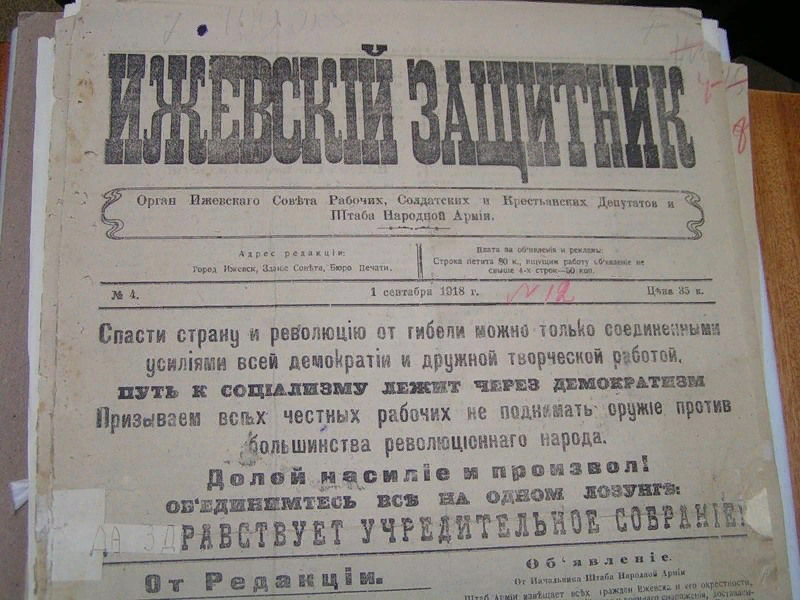Седьмого августа 1918 г. в Ижевск пришло телеграфное известие о взятии Казани частями Чехословацкого корпуса и Народной армии Комуча. В тот же день большевики созвали рабочих на митинг и объявили приказ о мобилизации в ряды Красной армии всех бывших военнослужащих, прибывших с фронтов 1-й мировой войны. Фронтовики согласно заранее принятому ими решению заявили, что они, без оружия и без обмундирования из Ижевска никуда не пойдут. В ответ большевики стали арестовывать руководителей фронтовиков и выносить им смертные приговоры. На следующий день, 8 августа, сигнал заводского гудка известил о начале антибольшевистского восстания в Ижевске. Готовясь к выступлению, рабочие заблаговременно запаслись винтовками и хранили их у себя по домам. 7 тыс. винтовок было захвачено на заводе. К вечеру город был полностью очищен от большевиков.