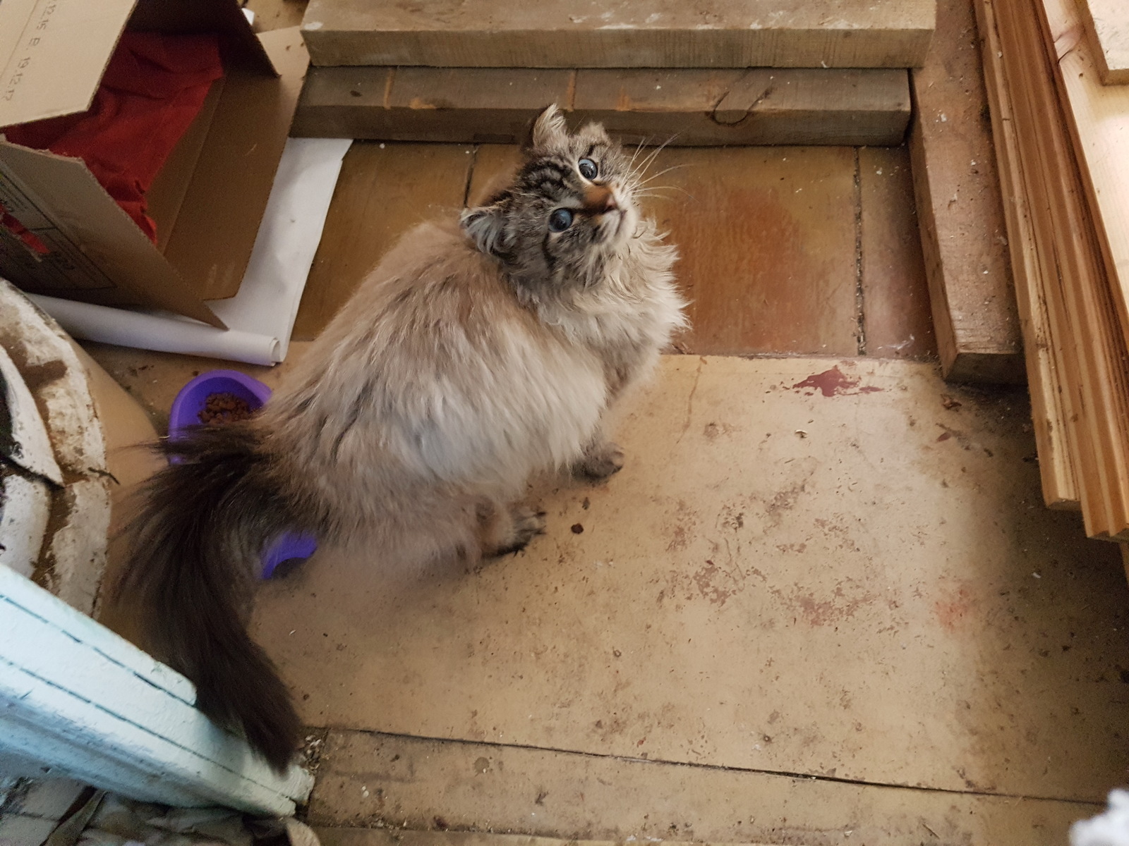 Взяли в машину, он начал забиваться ближе к воздуховоду в ногах и пищать. Кормили маленькими порциями раз 10, всё равно пищал и требовал еды. Плюс от холода кот сжался так, что выглядел как гармошка.