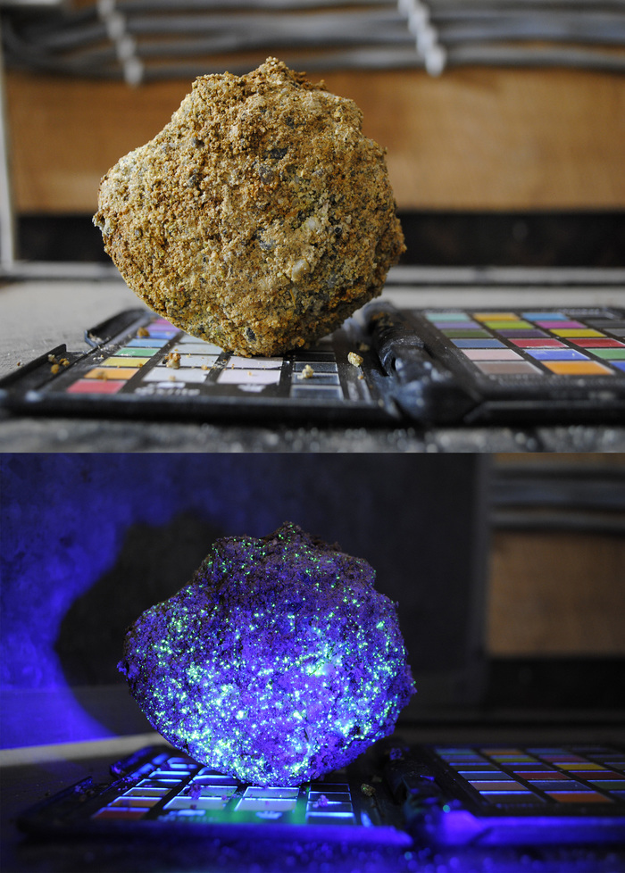7 tomimo.tokoso Урановая слюдка - Отенит 4 года назад Образец при дневном свете и под УФ [моё] Геология Уран Ещё 0
