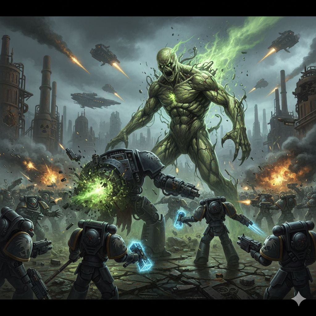 * Ряды астартес вдруг озаряются изнутри вспышками зеленого света. Болтеры, плазменные винтовки, гранаты в их руках начинают самопроизвольно делиться. Цепная реакция распада проходит по всему вооружению 1-й когорты.