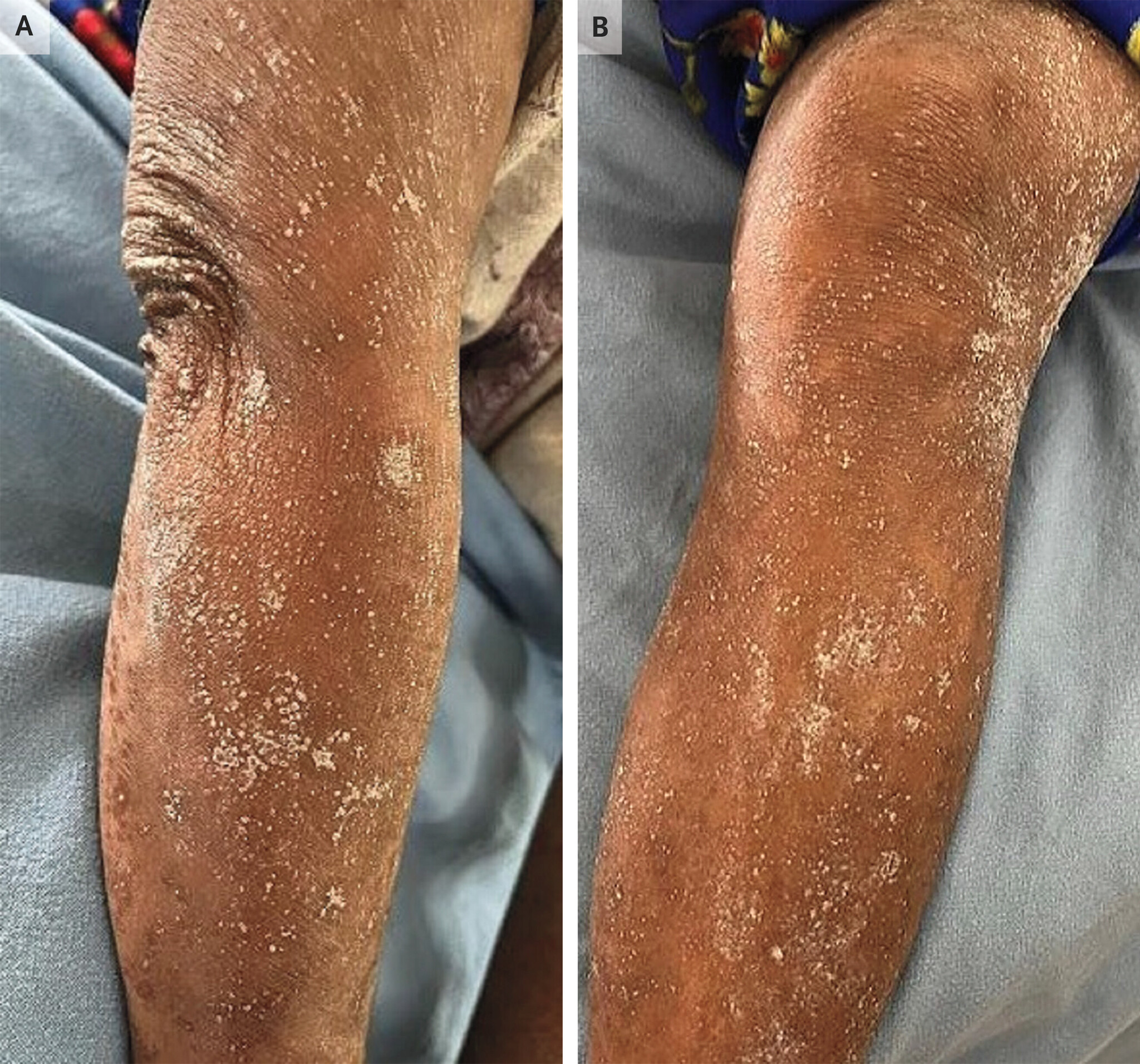 52-летняя женщина с артериальной гипертензией обратилась в больницу с жалобами на усталость в течение 1 месяца, а также на рвоту в течение 6 дней и спутанность сознания в течение 1 дня. За последние 20 лет она не получала регулярного лечения от гипертонии. При физикальном осмотре была отмечена бледность конъюнктивы и слизистой оболочки полости рта, а также порошкообразные кристаллические отложения на руках (фото А, правая рука), ногах (фото В, левая нога), туловище и волосистой части головы.
