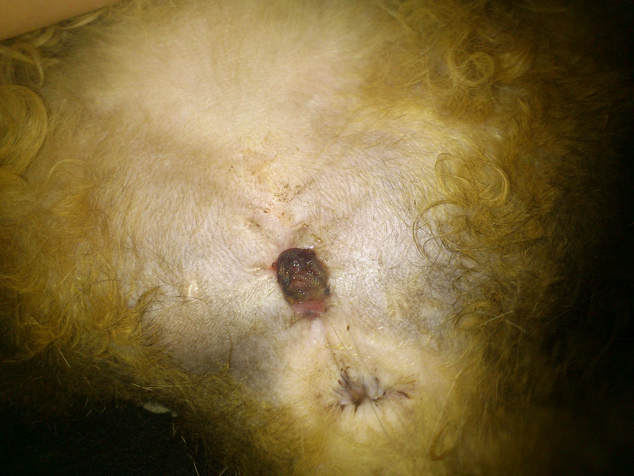 Через день появились выделения из шва с резким гнойным запахом (причем визуально шов не был страшнее вчерашнего). Просто случайно нажав на пузико при очередной обработке это все выяснилось. Пулей в ветеринарку!