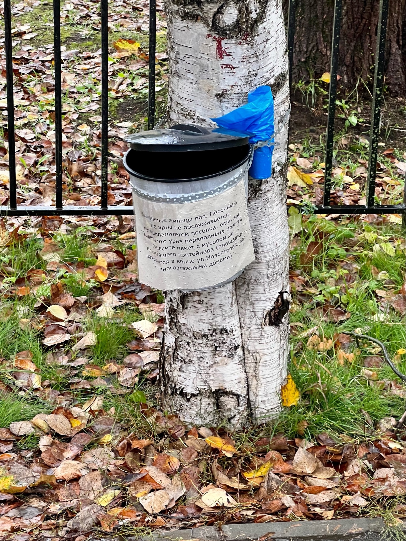 * небольшой пригородный посёлок в окрестностях Петербурга, население ~10.000 человек, муниципальных урн не сказать, что много, на некоторых улицах нет вообще, дворников тоже нет, мусор убирается редко и не слишком тщательно, потому неравнодушные жители пытаются что-то делать самостоятельно