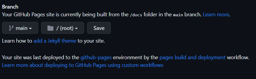 Сохраняем файл. Затем переходим в настройки и нажимаем "Pages". В пункте "Branch" указываем направление, где лежат наши файлы, и нажимаем "Save".