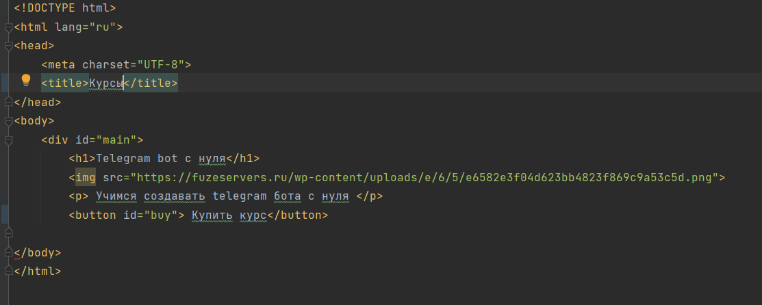 Теперь создадим свою собственную веб-страницу, которая откроется при нажатии на кнопку. Для этого внутри проекта нужно создать HTML-файл, который мы попробуем отобразить в веб-приложении в Telegram боте. Внутри HTML-файла прописываем стандартную HTML-разметку и основное содержимое нашей страницы(данную разметку можно найти в моем Telegram канале: https://t.me/CodeCashh).