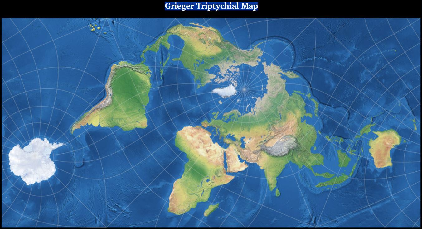 Триптихиальная проекция Бьёрна Григера представляет собой карту всего мира, показывающую все континенты, включая Антарктиду, с минимальными искажениями и без каких-либо пересечений.