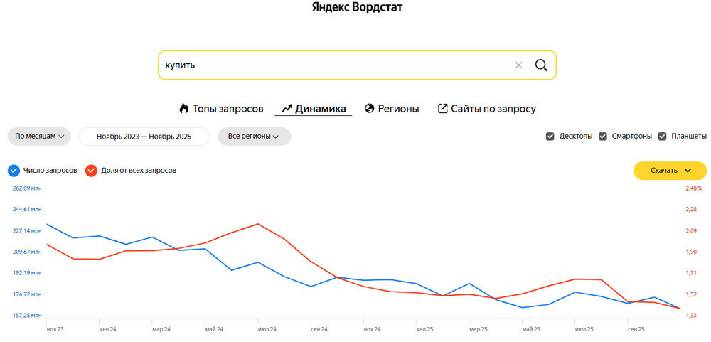 Уровень жизни населения России легко отслеживается по Яндексу.Вордстат - сервису частотности поисковых запросов. С ноября 2023 года по ноябрь 2025 года желание у народа что-нибудь купить снизилось со значения 235 млн запросов до 165 млн запросов - то есть понизилось на 30 процентов.