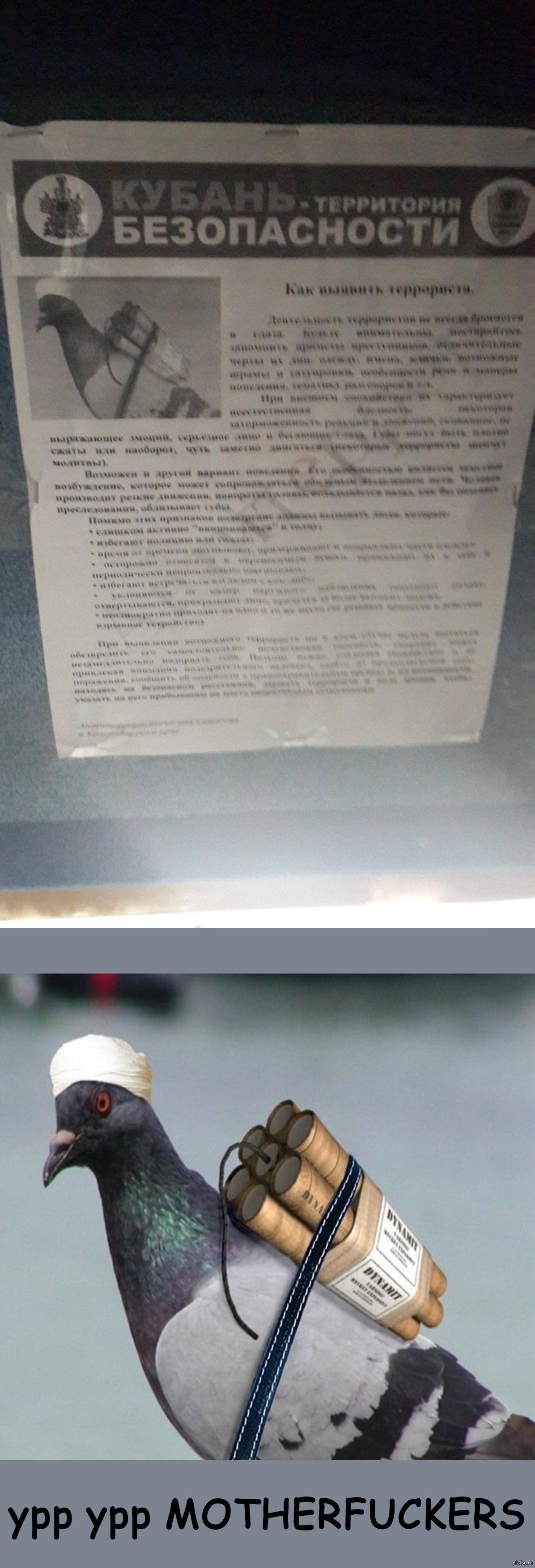 8 DELETED Урр Урр MOTHERFUCKERS 11 лет назад Увидел в маршрутке, я понимаю терроризм серьёзная тема, памятка полезна, но ПОЧЕМУ ГОЛУБЬ? простите за качество, фотал на ходу, ниже найденный в инете аналог [моё] Голубь Мир Памятка Терроризм