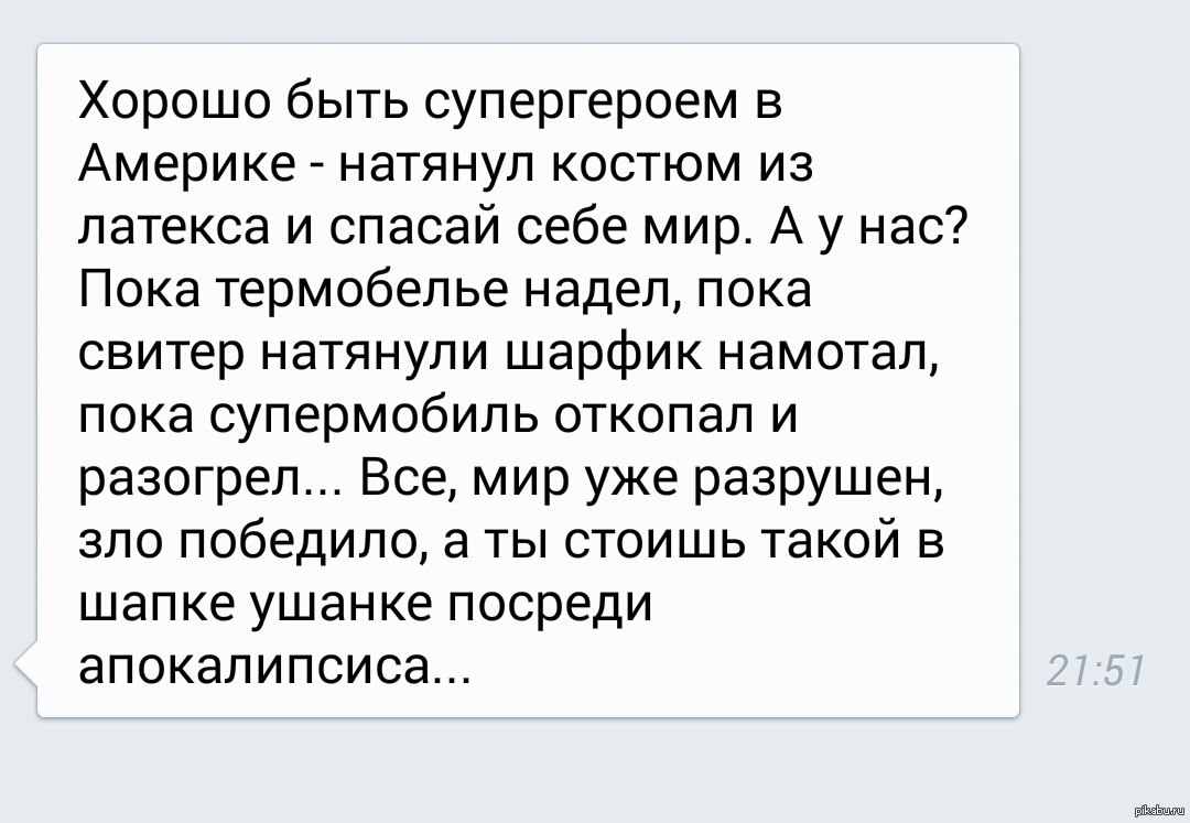 Злу тоже сначала одеться надо. Вы видели, например, Джокера? Бедняга в своем синем костюмчике будет трястись в сугробе, русскому бэтмену в ватнике и маске поверх ушанки его придется полчаса горячим чаем отпаивать, прежде чем он сможет внятно сказать откуда у него шрамы.