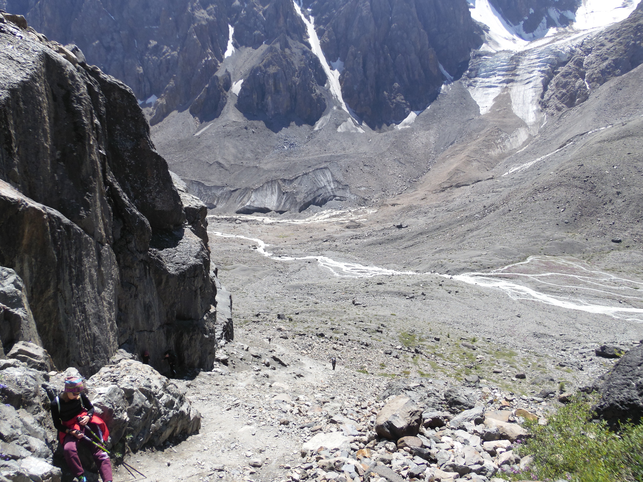 Айкумари отдыхает. Внизу можно разглядеть других путешественников. В правом верхнем углу правый ледник Большого Актру.