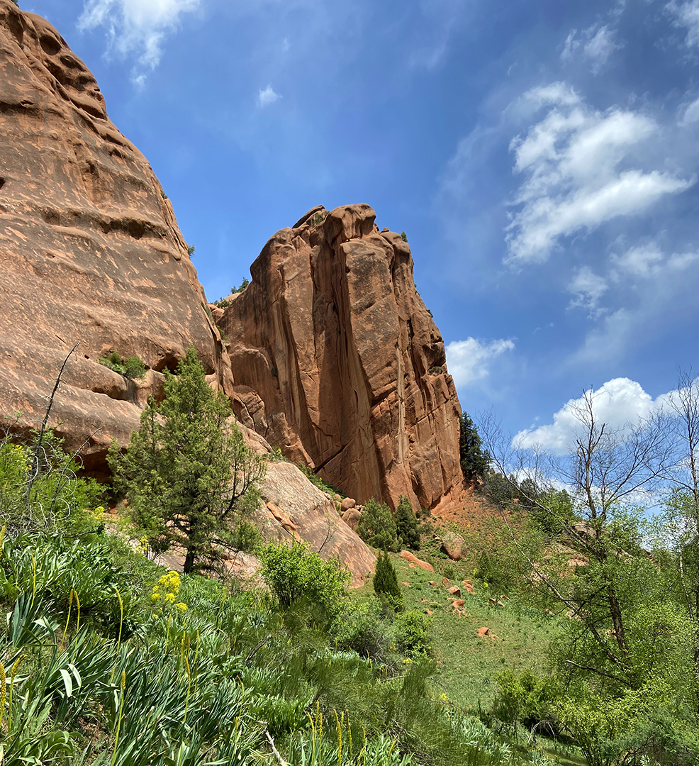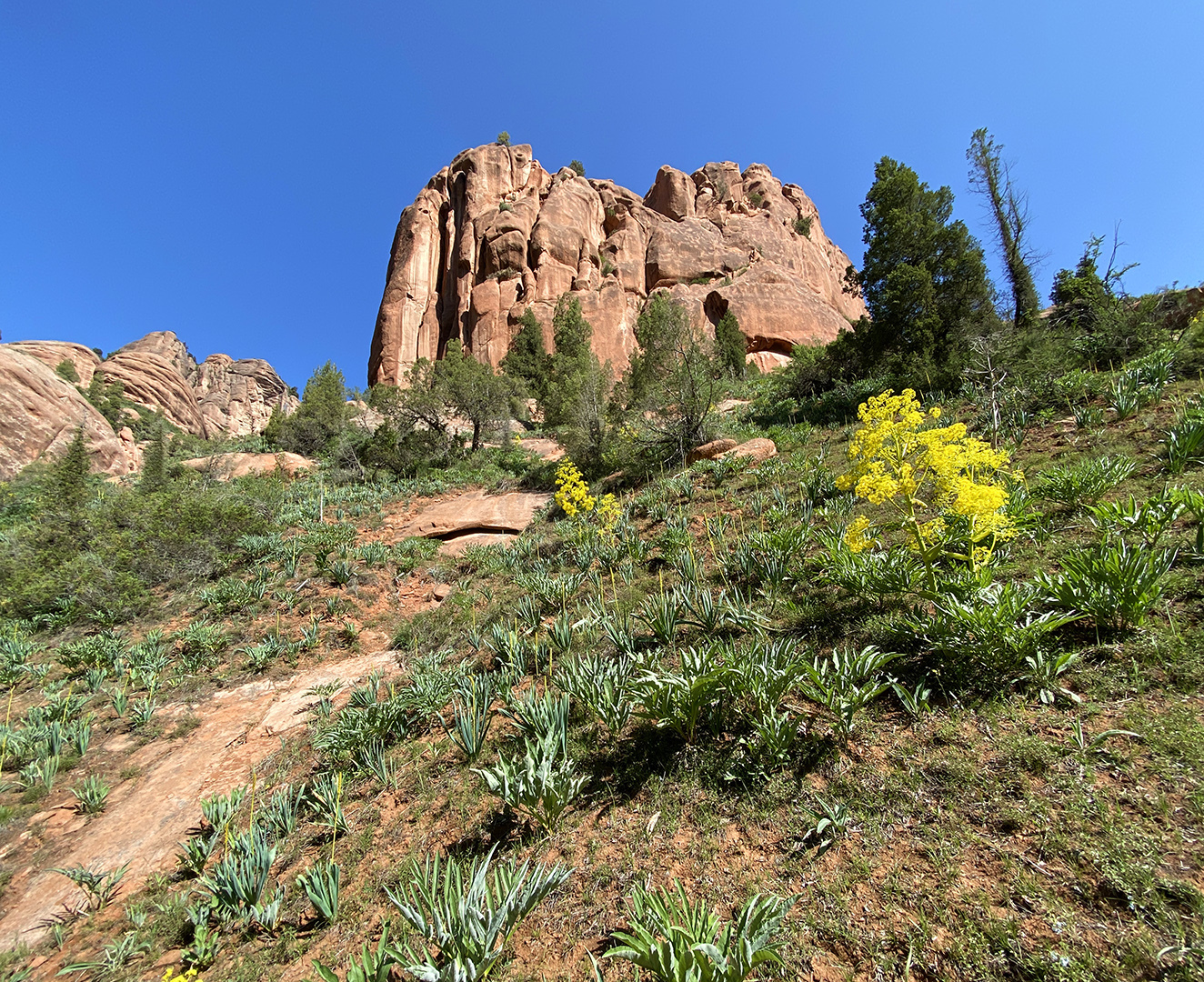 Путь пролегает мимо красно-оранжевых скал, сложенных из рыхлого песчаника.