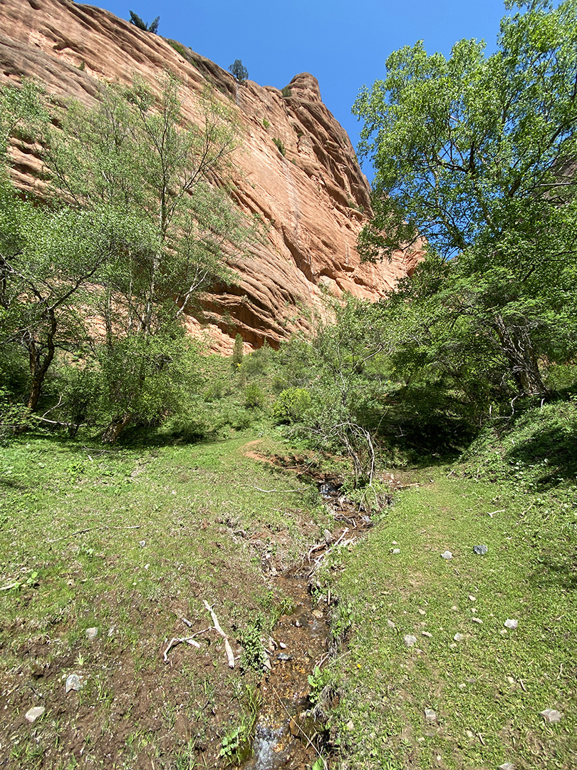Киргизия, Ошская область. По живописному ущелью красных скал легко дойти до двух водопадов. Здесь расскажу о первом из них.