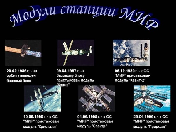 Первый 20-тонный базовый модуль станции «Мир» был выведен на орбиту в феврале 1986. «Мир» должен был стать воплощением извечной мечты писателей-фантастов о космической деревне. Изначально станцию строили так, чтобы к ней можно было постоянно добавлять новые и новые модули. Запуск «Мира» приурочили к XXVII съезду КПСС.