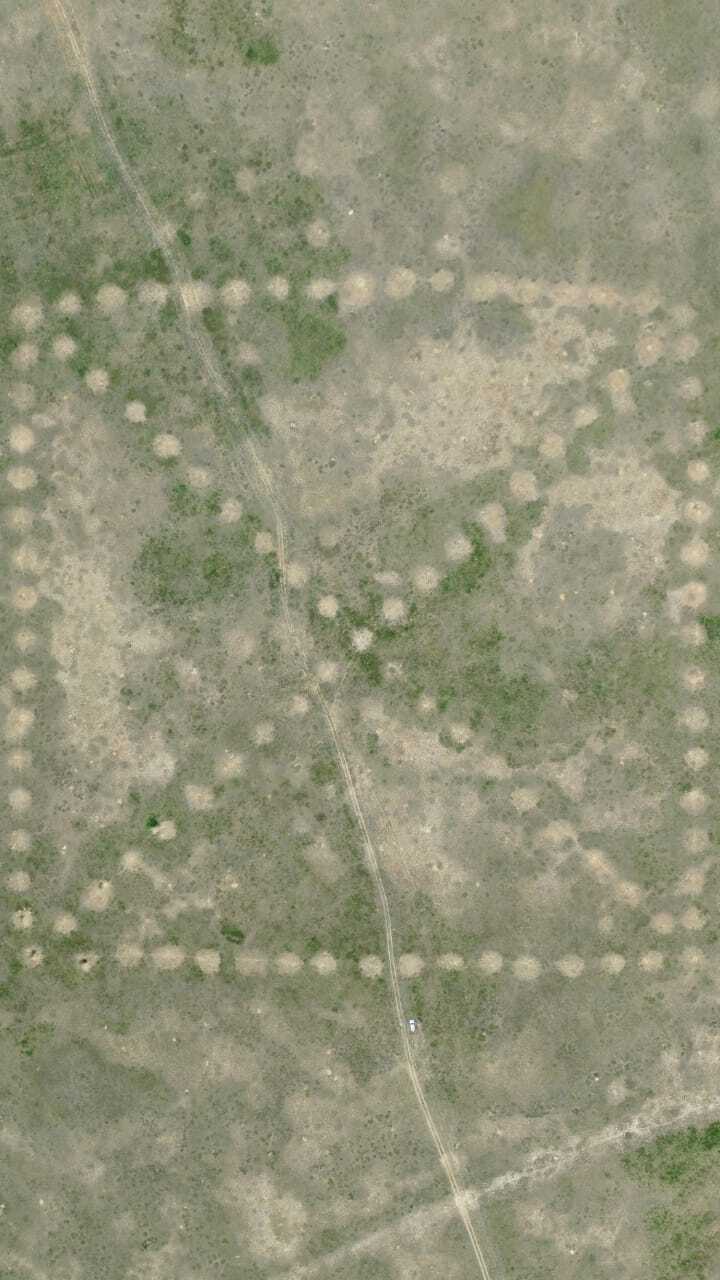 Он такой огромный, что пришлось взлетать на 416 метров, чтобы он поместился. Выше не решились, ветер в степи очень сильный и дрон уже с 200 метров очень просил вернуться на землю. Но раз приехали, надо же посмотреть. Машина на фоне квадрата смотрится такой маленькой, просто мелкая белая черточка внизу.