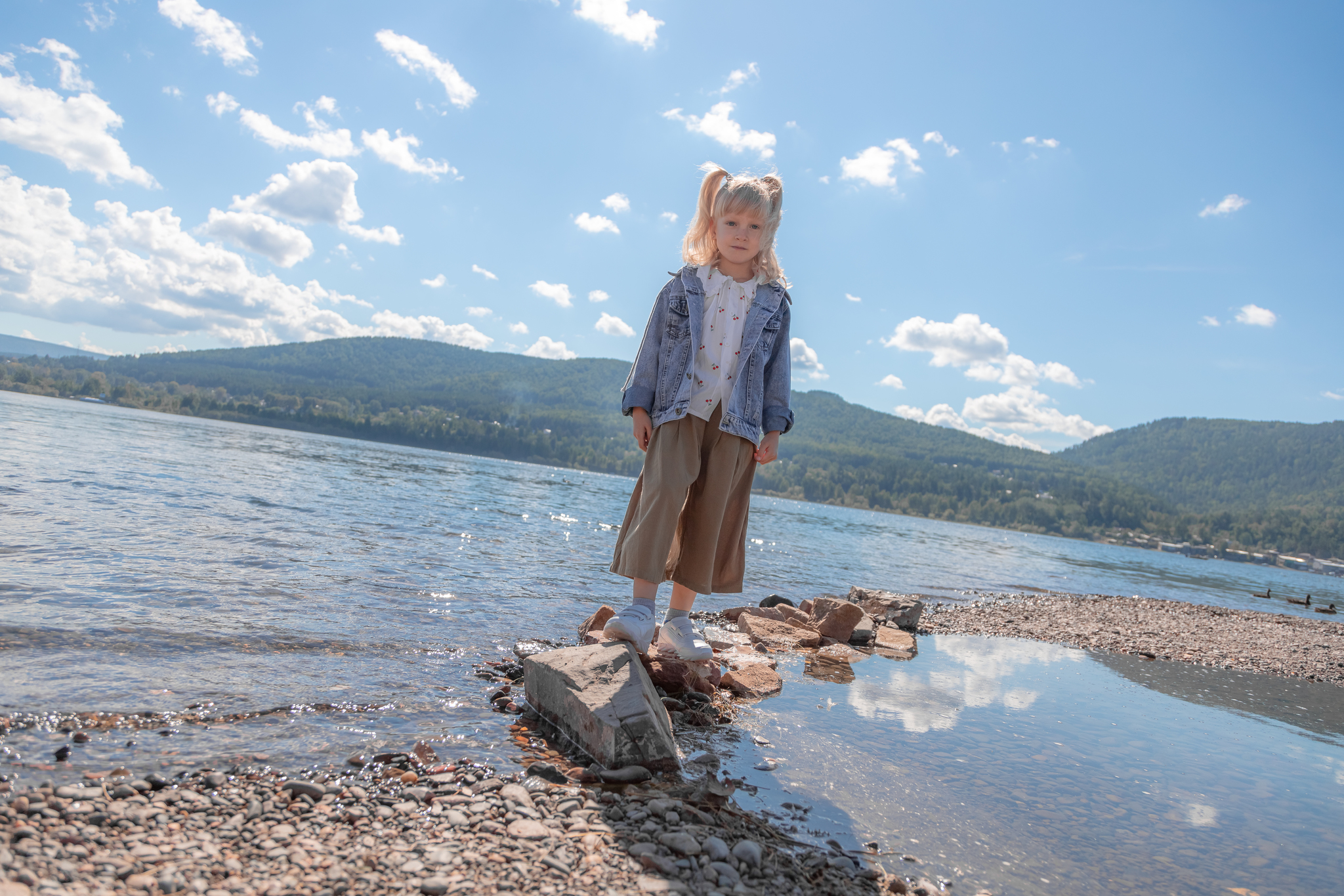Вот моя младшая красота на фоне Енисея. Горизонт завален, но мне почему-то именно эта фотка понравилась сильнее других.