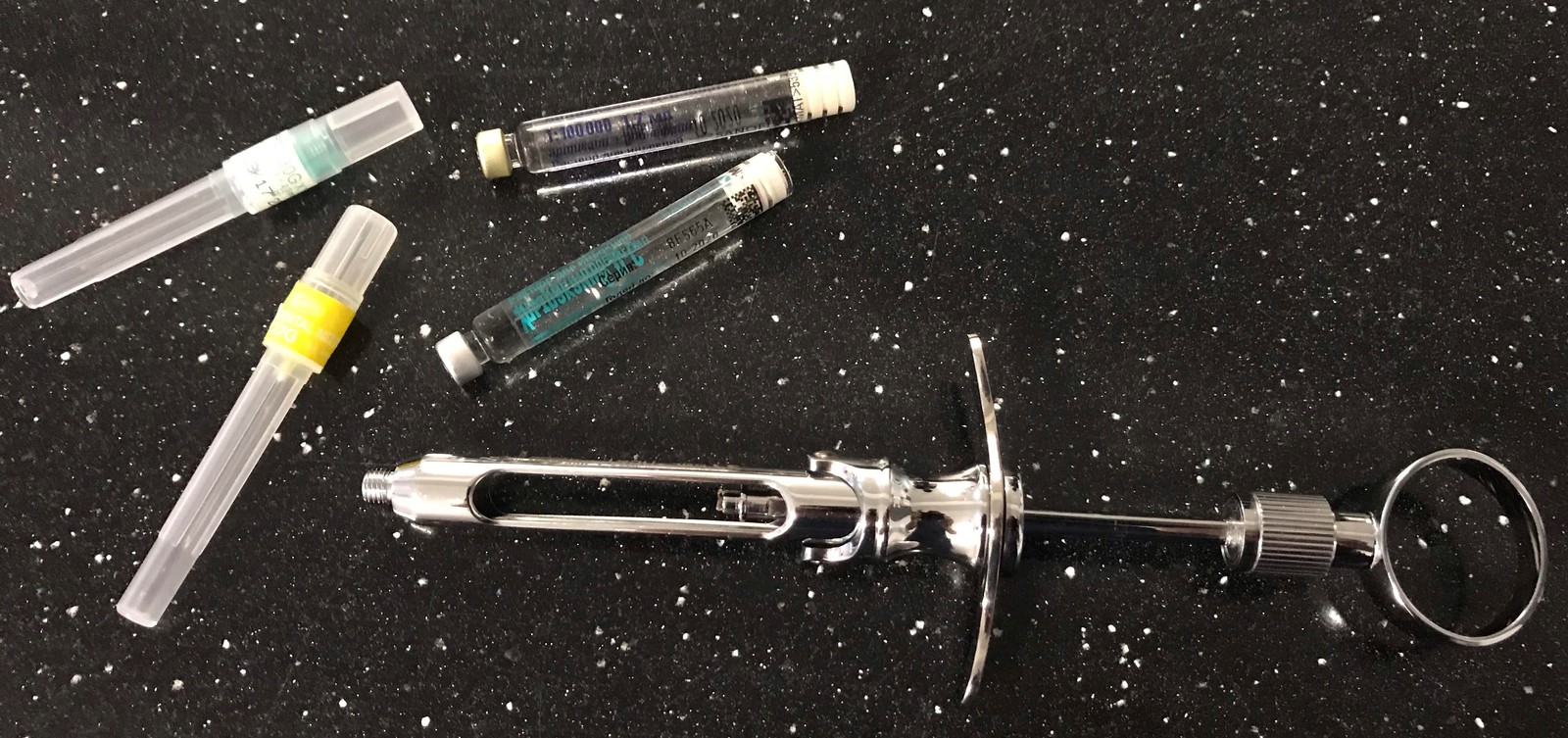 Далее проводится инфильтрация анестетика в области планируемой операции. На фото представлен многоразовый карпульный шприц, который, естественно, после каждого пациента стерилизуется, как и любой другой инструмент. Две одноразовые карпулы с анестетиком и две иглы разной длины: