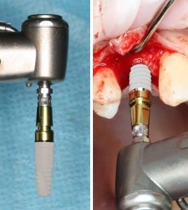 Имплантат нужного размера (3.8х11 мм) фиксируется на гексагональном ключе, после чего устанавливается в подготовленную лунку: