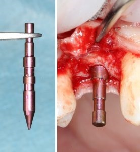 Далее, с помощью пилотной фрезы диаметром 2 мм задаётся ось лунки будущего имплантата, которую контролируем при помощи пинов*