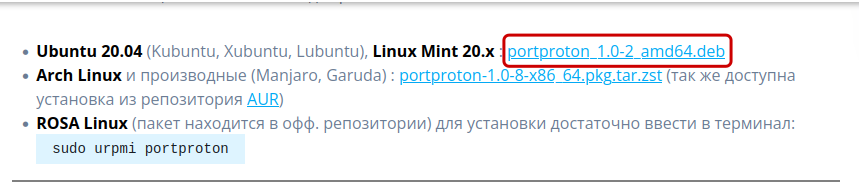 Отматываем новую страницу немного вниз. Жмем на portproton_1.0-2_amd64.deb (со временем версия программы может измениться)