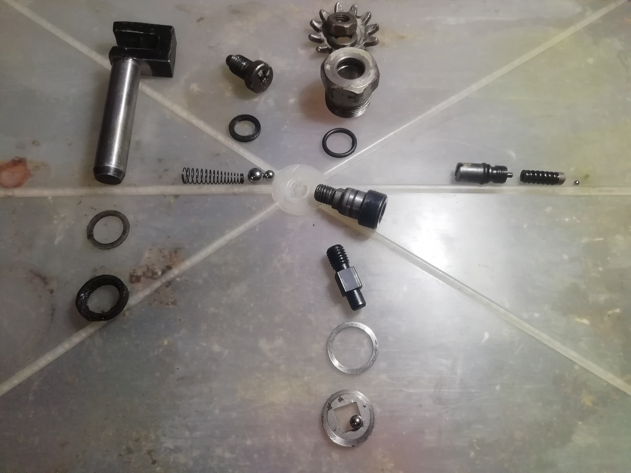 Запорный клапан поставить на место у многих вызывает трудности кто сталкивается с ним впервые. Остановлюсь на этом подробнее. Винт с квадратным основанием должен иметь ход в верх и вниз (для возможности зажимать шарик в седло) сам он не вращается (его вращение ограничивает шайба с квадратным отверстием которое зажимаетсяв корпусе большой гайкой. А движение вверх и вниз осуществляется цилиндрической гайкой которая вращается шестеренкой. В момент обратной сборки винт с квадратным основанием должен быть выше шарика клапана. И дабы он не опускался в момент закручивания гайку ключиком на 10 придерживает в одном положении. И когда большая гайка затянута клапан должен вращатся. И влеко и в право. Если ни туда и ни сюда опять разбираем (винт был низко опущен и все зажалось не как должно) и собираем по новой. Проверяем, крутим влево и в какой-то момент должны упереться в шарик.