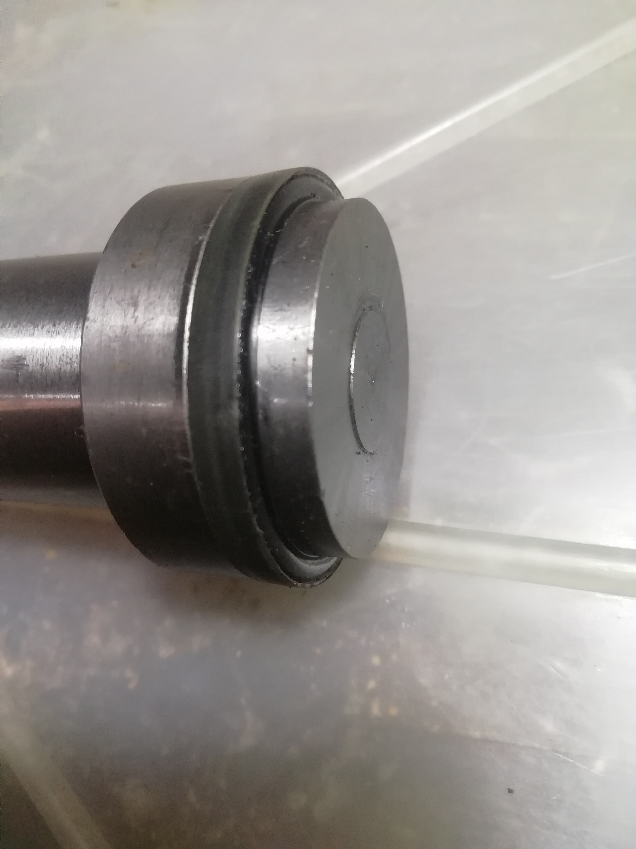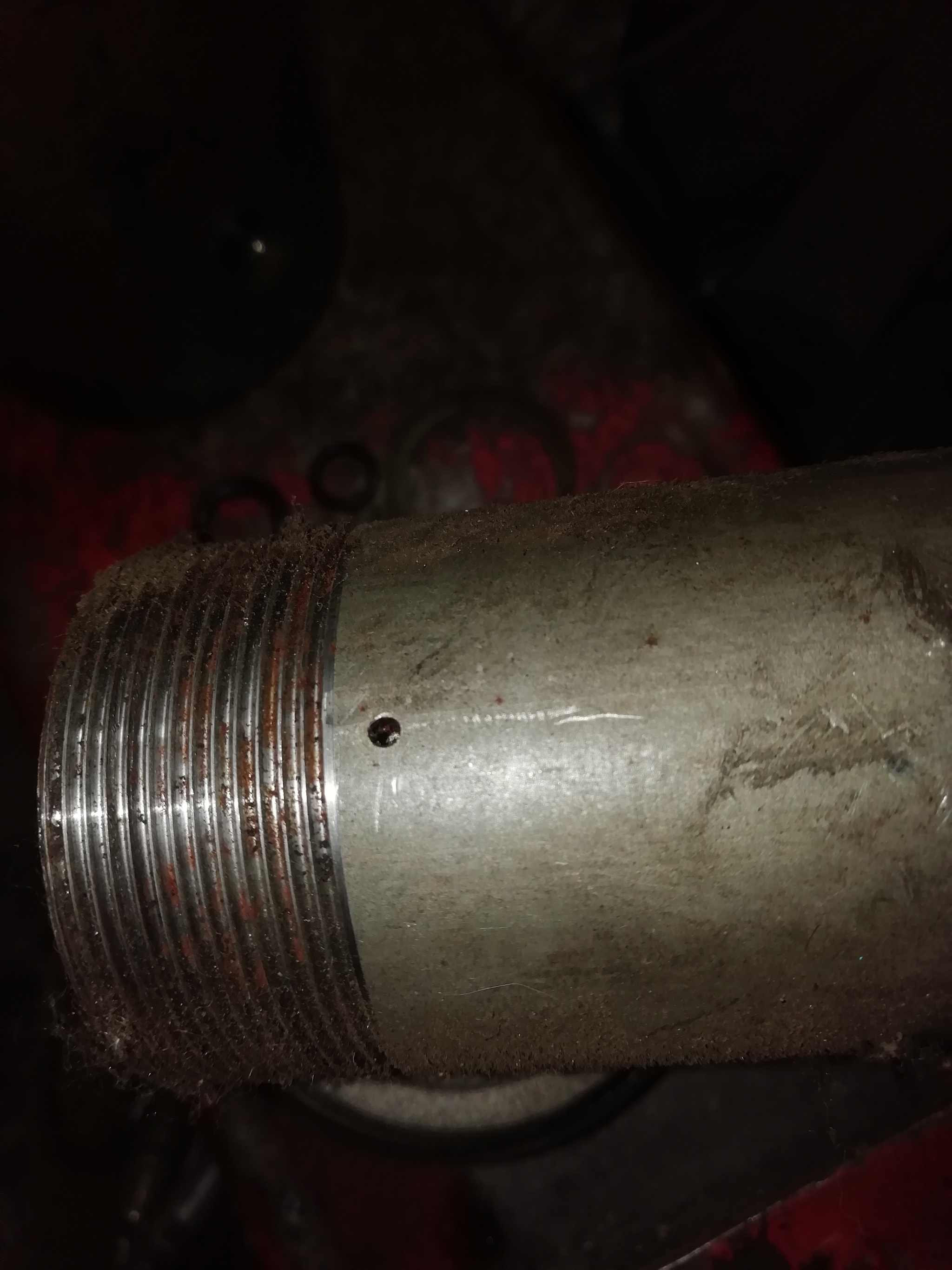 Царапину на пластиковом кольце может давать ограничитель максимального хода цилиндра. Который выполнен в виде небольших просверленых отверстий в верхней части направляющей трубе. Выдвинув поршень дальше них, происходит утечка масла и поршень опускается закрывая их.