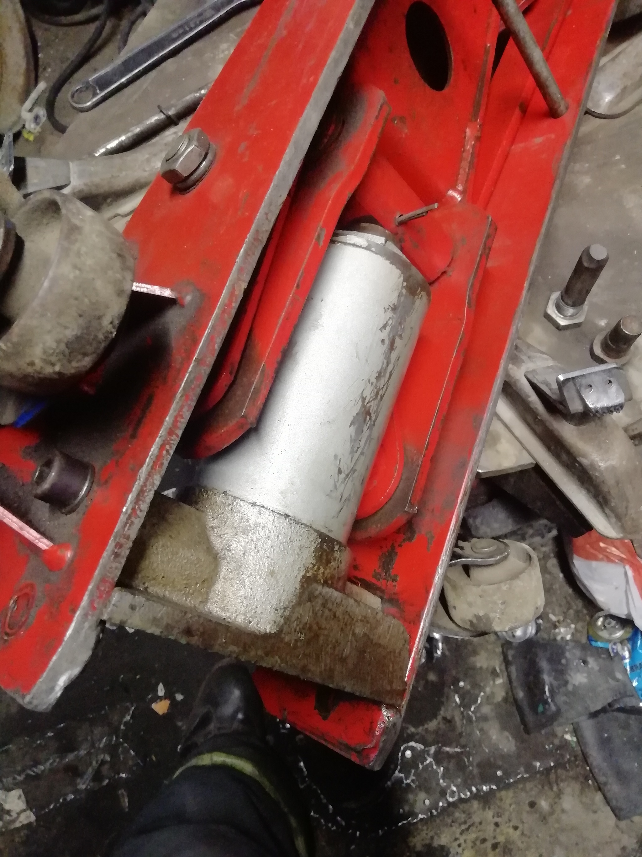 Два болта под шестигранник на 10 (я колёсики не снимаю, если хотите можете снять предварительно) и в передней части гидроцилиндра выпремляем шплинт. Вынимаем далее из рамы, снимаем врзвратную пружину и вытаскиваем шплинт.