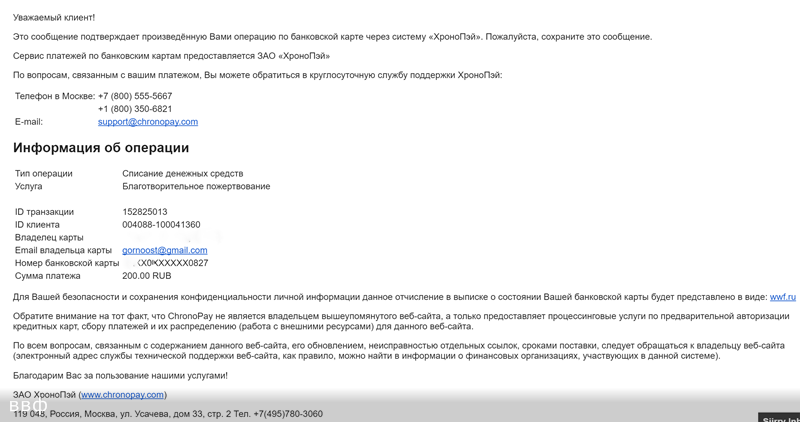 Для Вашей безопасности и сохранения конфиденциальности личной информации данное отчисление в выписке о состоянии Вашей банковской карты будет представлено в виде: wwf.ru