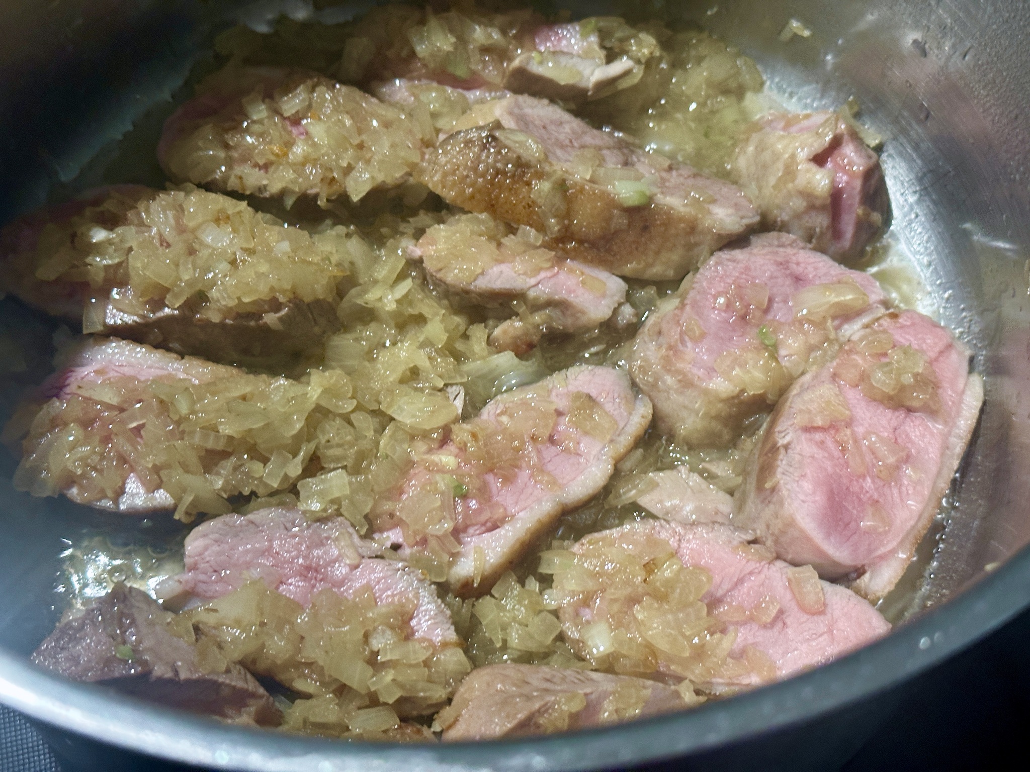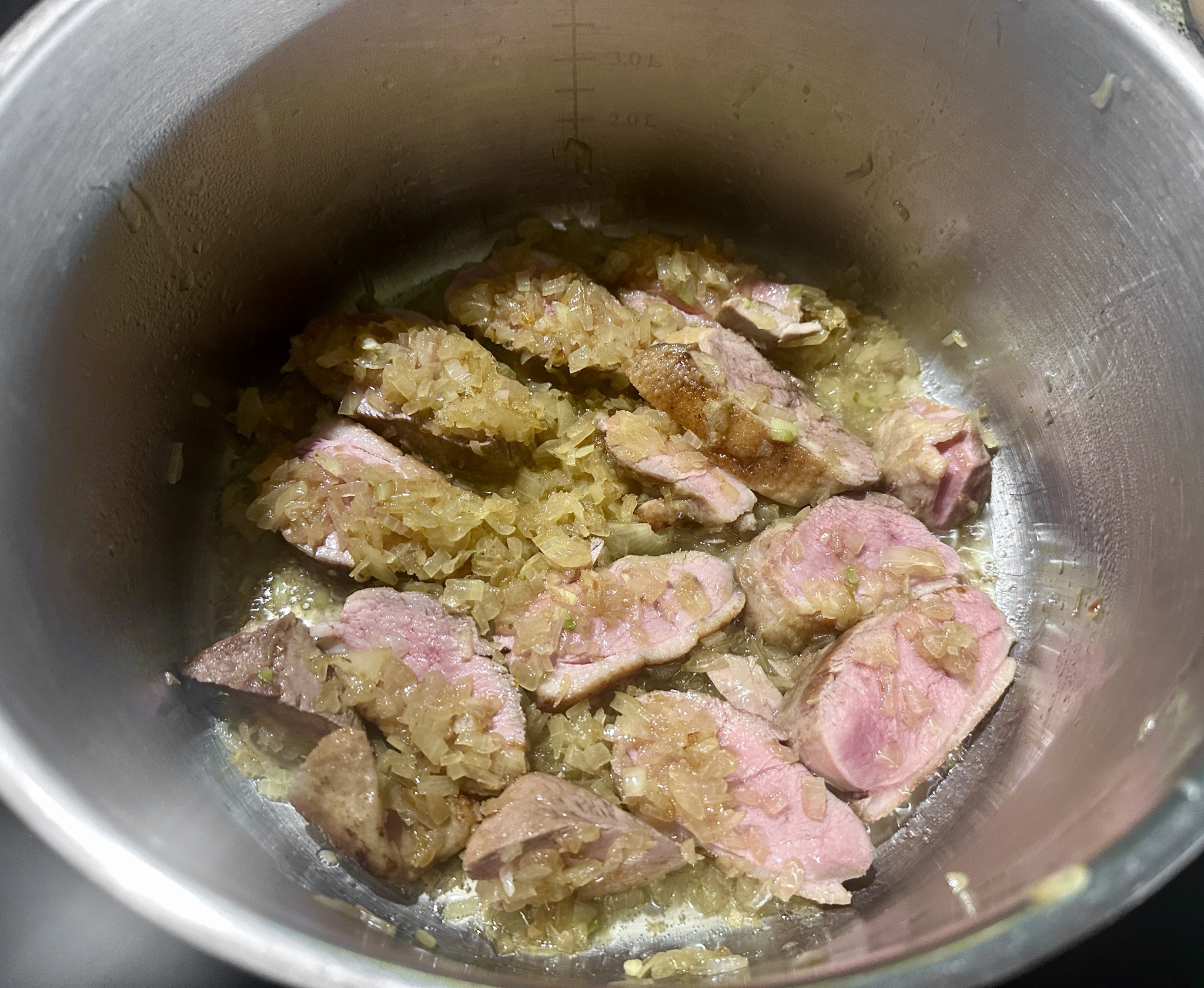 Лук выложил в кастрюлю. Поверх утиным ломтиков.
