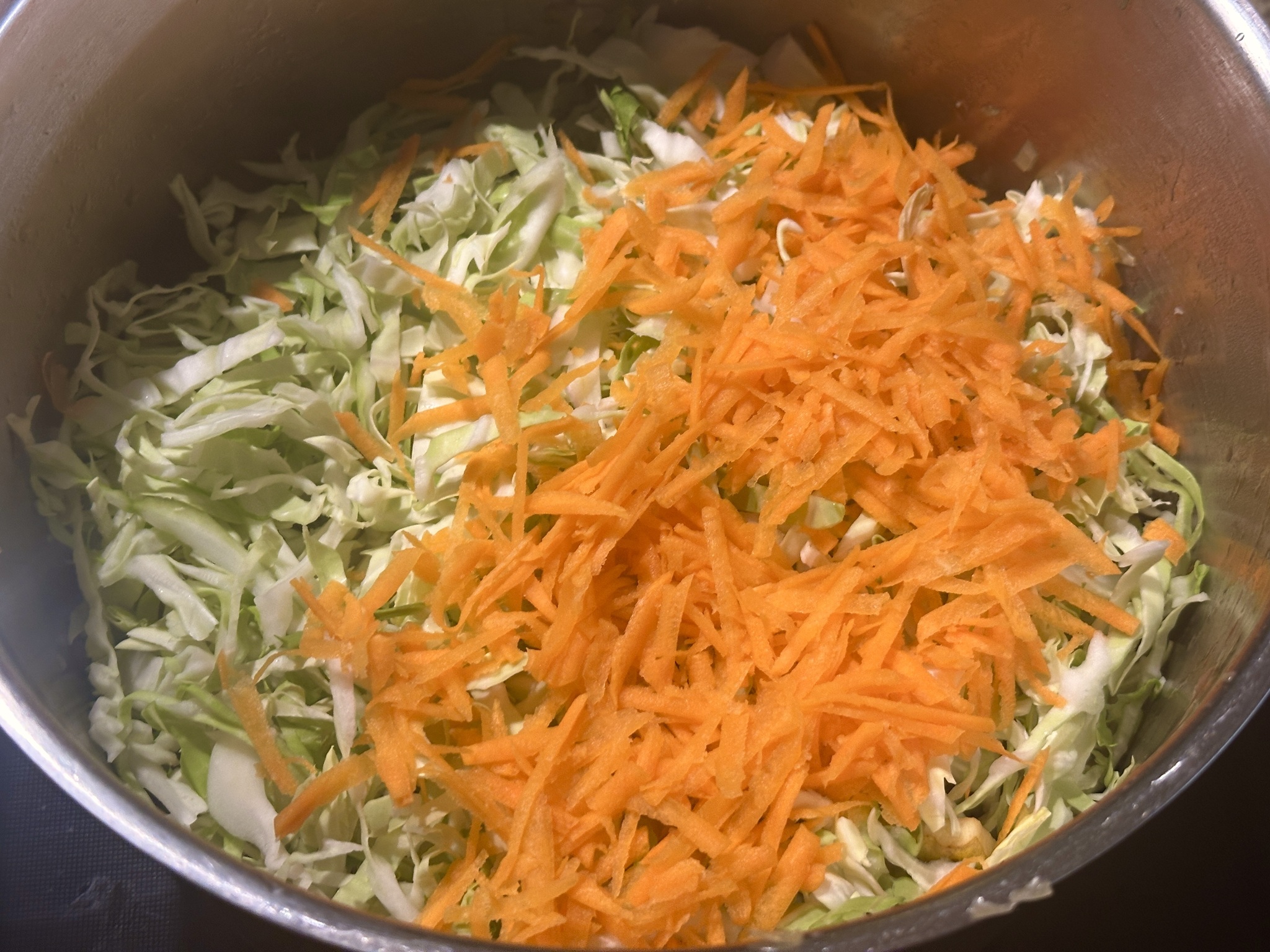 Капусту тонко нашинковал, морковку натер на крупной тёрке. А потом слоями выложил поверх утки. По чуть-чуть каждый слой присолил.