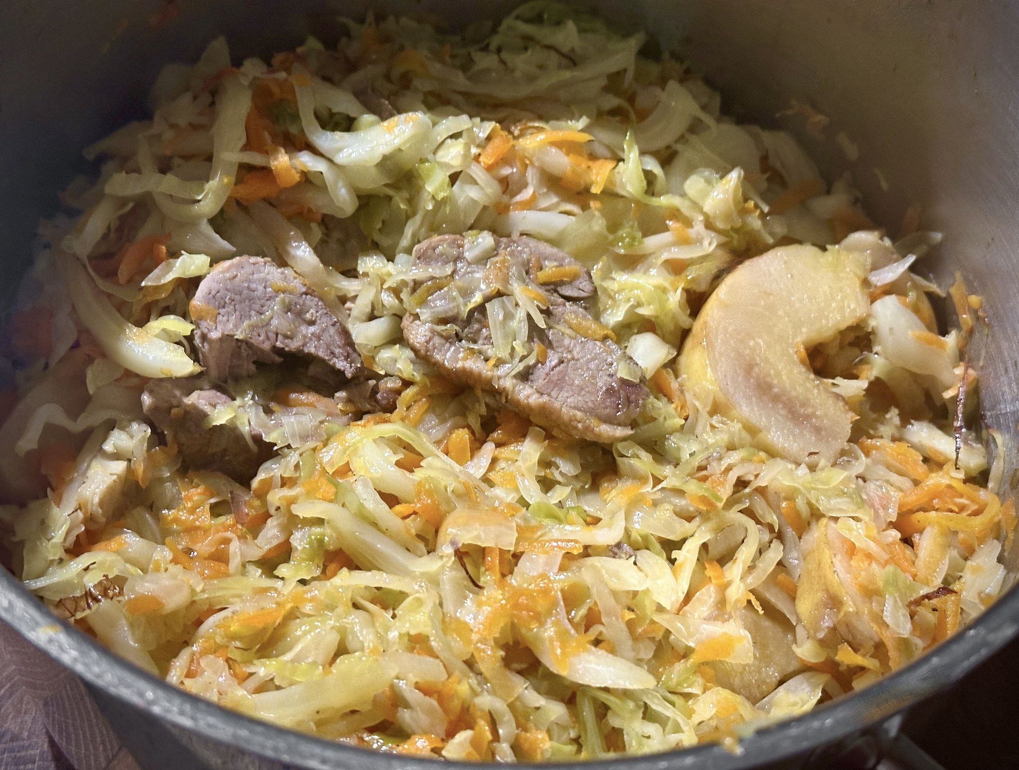 Держал кастрюлю на плите пятнадцать минут. Нагрев чуть «ниже среднего». За это время раза три деликатно ворошил содержимое. Масло и лук со дна равномерно распределилось в массе капусты.