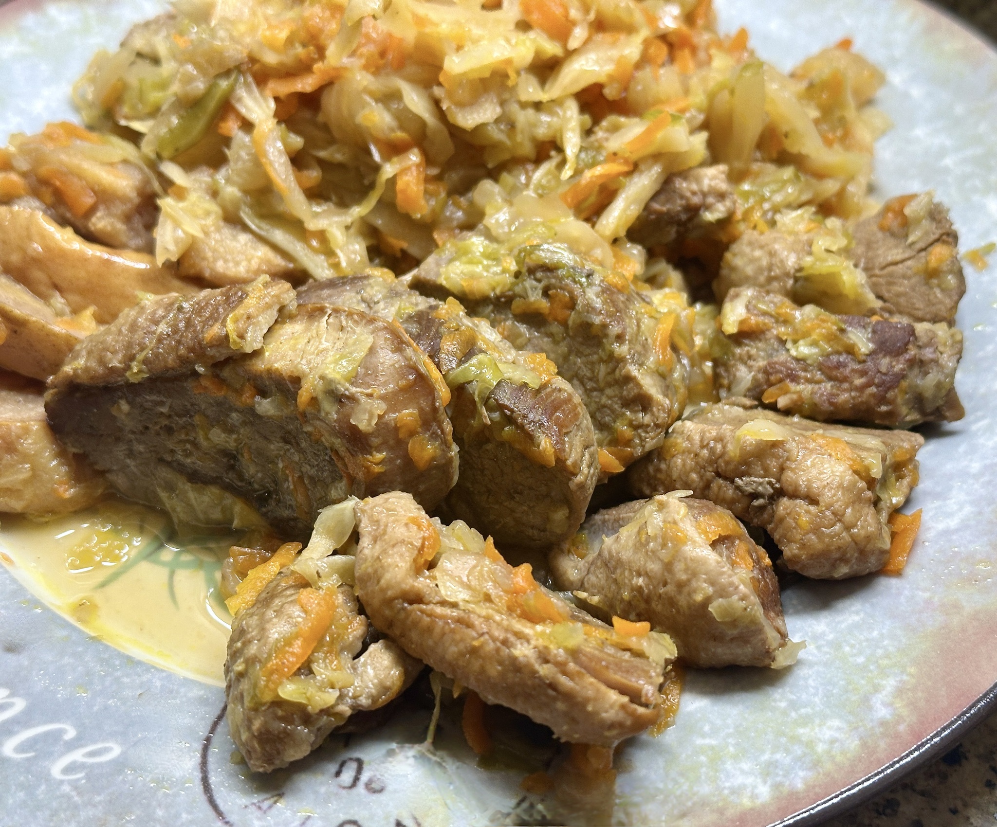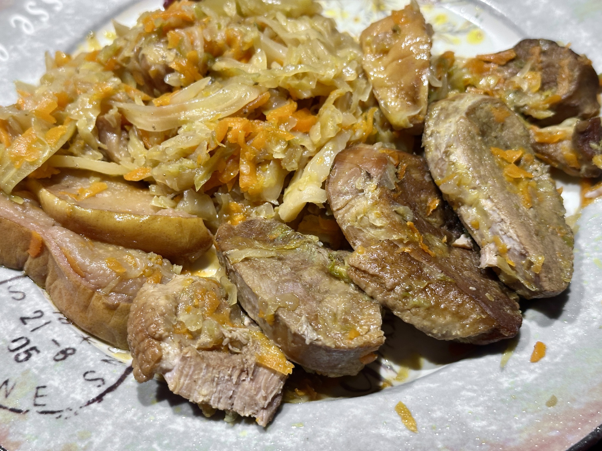 Я не буду вкус описывать, не смогу. Просто замечу, что утка получилась мягкая и сочная. Капуста, я, кстати, молодую взял, пропарилась скорее, а не потушилась и стала такая…, нежно-упругая. Ну и, конечно, утка капусте придала очень интересные и приятные вкусовые ощущения, как и капуста …, одним словом, очень вкусно вышло.