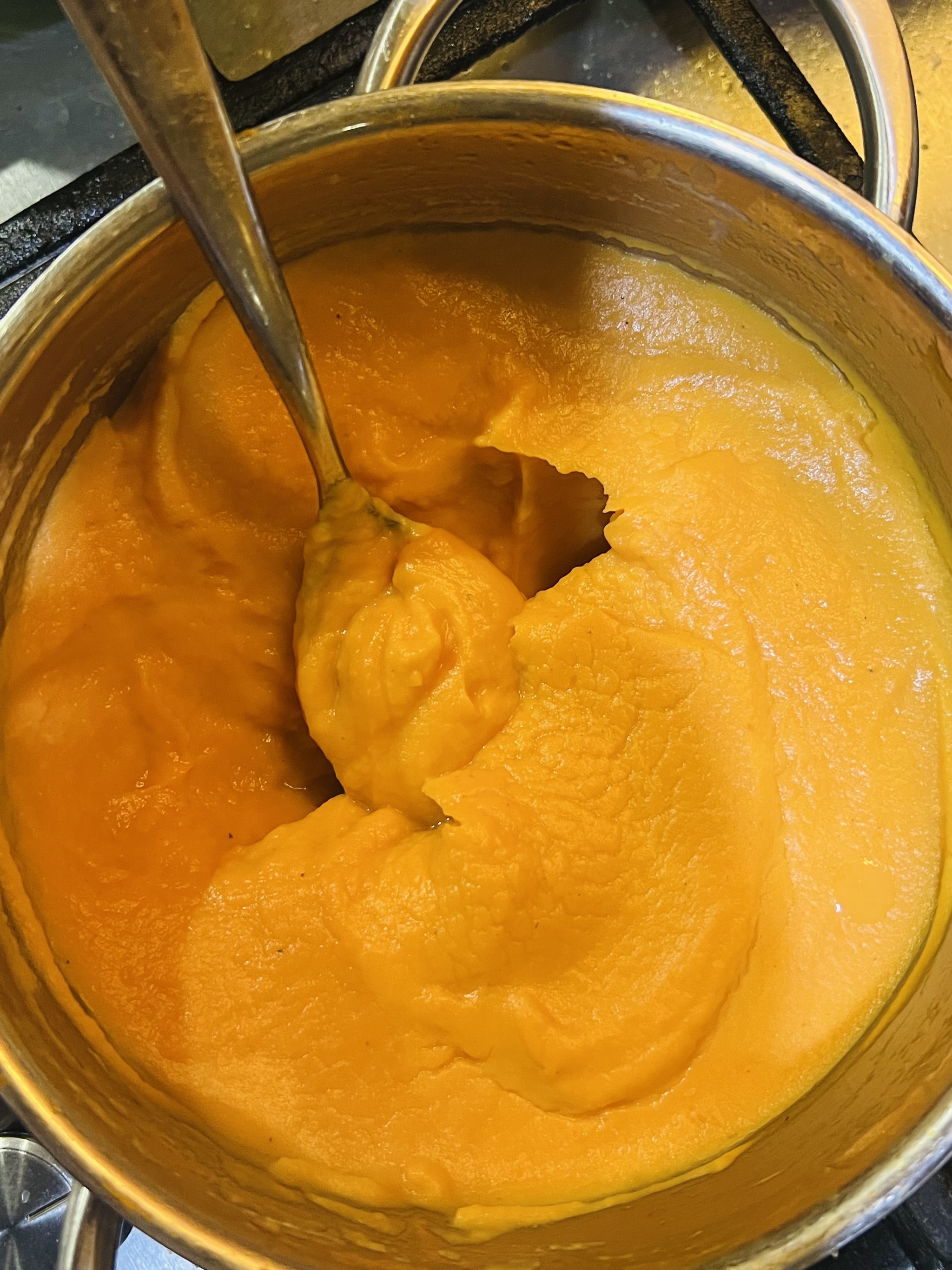 - Батат чистим, режем кубиками. Отвариваем в подсоленной воде 15-20 минут до мягкости. Сливаем воду, добавляем подогретые сливки и щепотку мускатного ореха, соль по вкусу. Пробиваем блендером до состояния нежного крема.